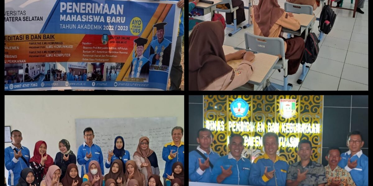 Dalam rangka mempromosikan Penerimaan Mahasiswa Baru (PMB) Universitas Sumatera Selatan (USS), Tim Promosi FE USS melakukan sosialisasi ke beberapa wilayah di Banyuasin pada Jumat (12/08/2022) kemarin. Tim yang dipenggawai oleh Wakil Dekan FE USS Bapak Firmansyah, S.E.,M.Si. dan Kaprodi Manajamen Ibu Santi Oktavianti, S.Pd.,M.M. melakukan kunjungan ke 8 titik posko. Tim meminta bantuan mahasiswa dan alumni untuk menjadi penanggung jawab posko. Metode promosi yang dilakukan adalah beraudiensi dan memasang banner PMB. Tim berangkat dari Kampus A USS langsung dilepas oleh Dekan FE USS Bapak Teguh Iman Santoso, S.Sos.,M.M.,Ph.D. pada pagi hari sekitar pukul 09.00 WIB dan kembali pada malam hari sekitar pukul 20.00 WIB.